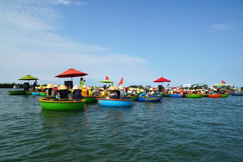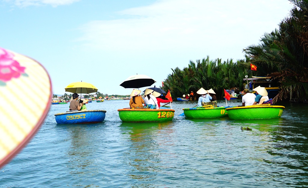 대나무로 엮어 만든 동그란 바구니 배에 몸을 싣고